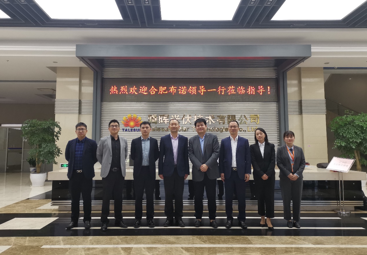 近日,合肥布諾太陽能科技有限公司總經理代習軍、副總王峰等一行拜訪蘇州騰暉光伏總部,與騰暉光伏總裁盛昊等一行領導就國際光伏產業現狀及未來發展進行深入探討,并簽署了2021年200MW戰略合作協議。