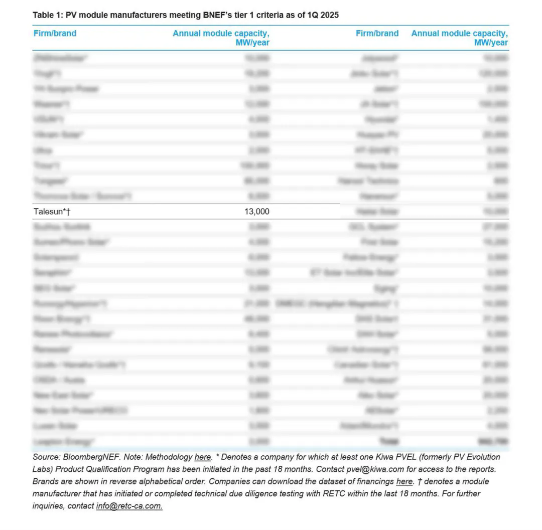 近日,全球知名研究機構彭博新能源財經(BNEF)發布了2025年第一季度Tier1全球一級組件制造廠商榜單,騰暉光伏憑借卓越的技術創新能力、穩健的財務表現及全球市場影響力成功入選該榜單。