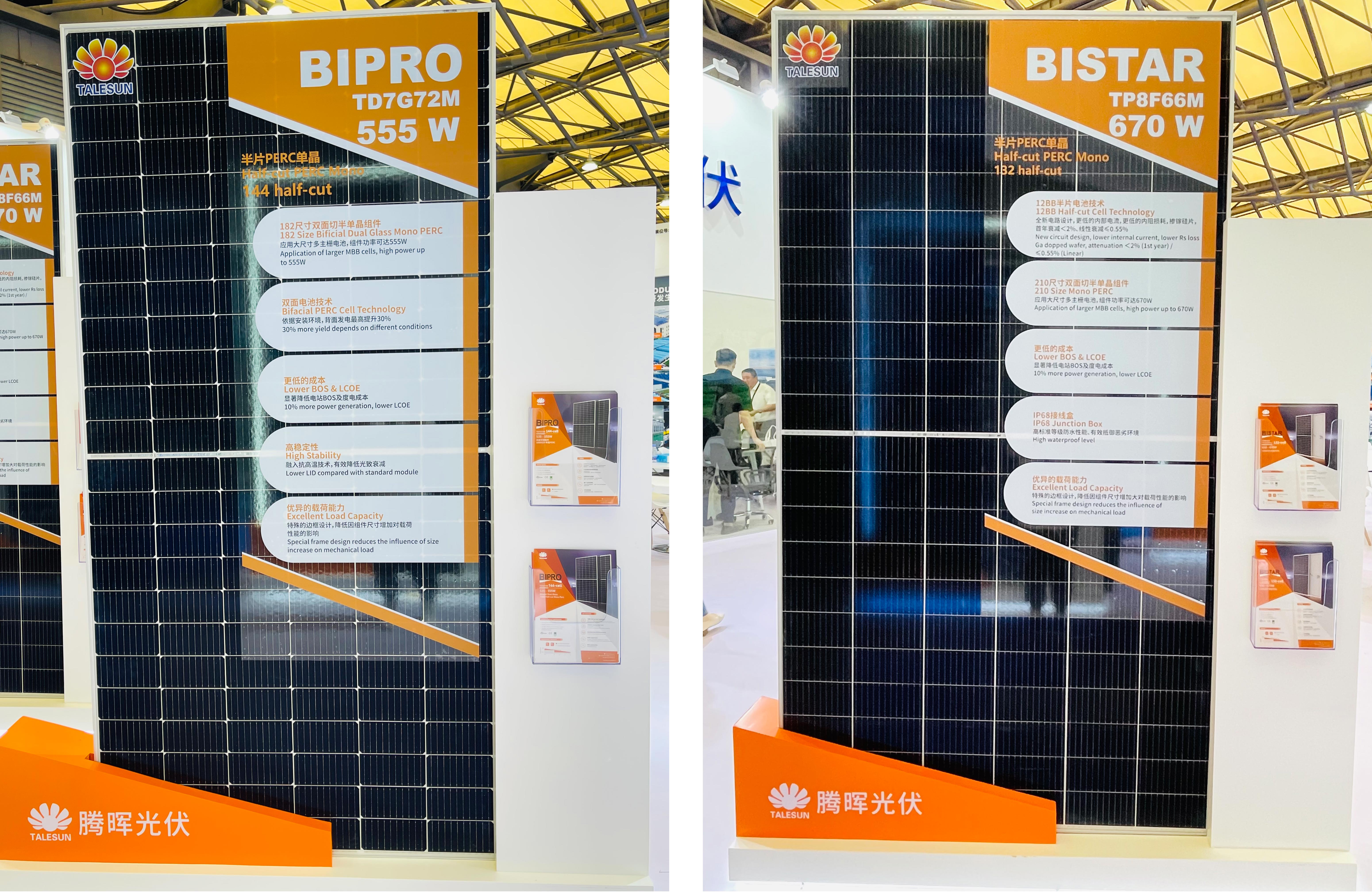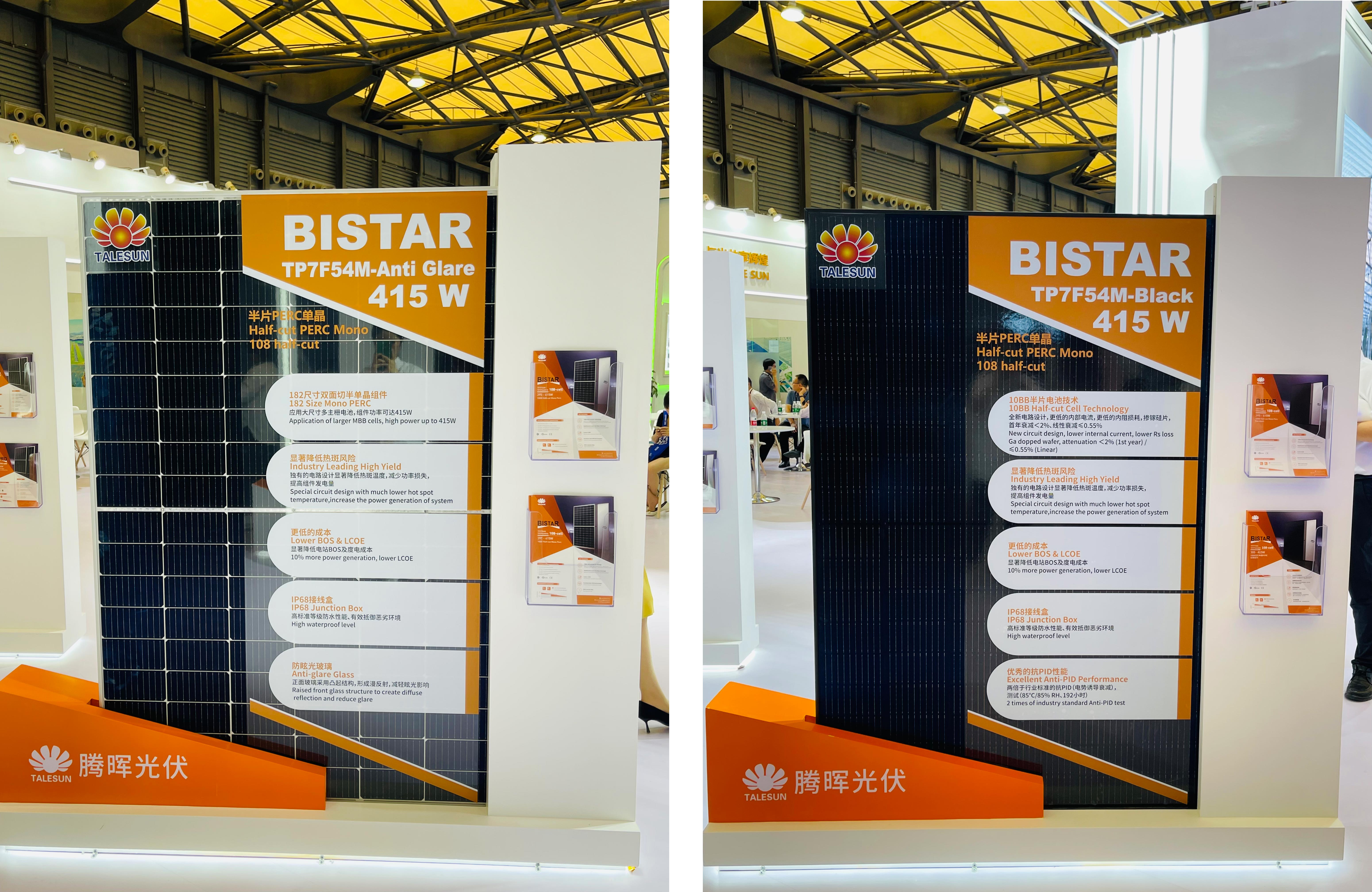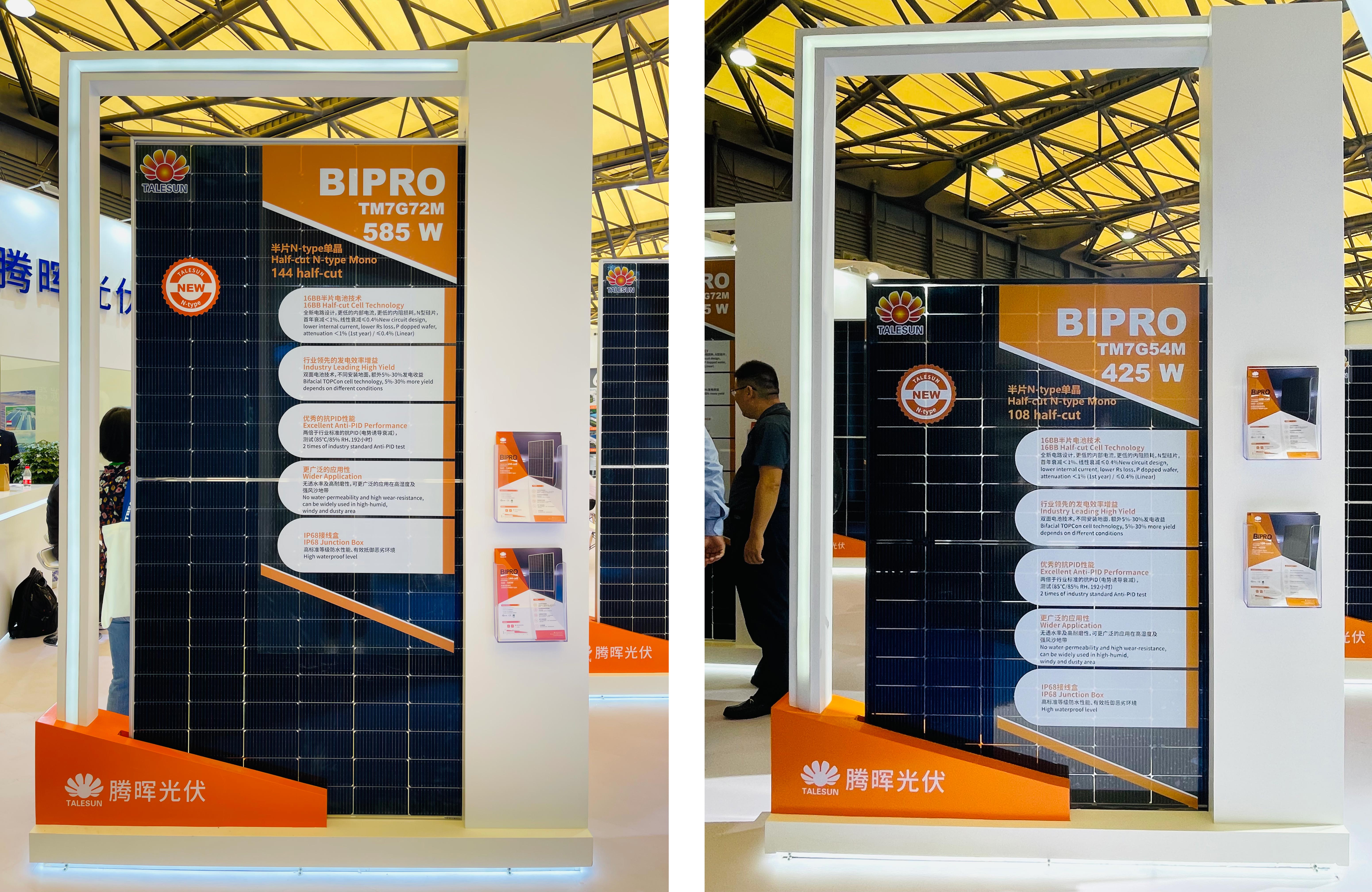 位于 E1-530 展臺的騰暉光伏,首次攜 N 型組件在國內亮相,正式宣布進入“N”時代。此次展出兩款組件分別為:BIPRO_TM7G72M 及 BIPRO_TM7G54M。由于 N 型組件更低的溫度系數、更高的雙面率、更低光致衰減等方面的發電性能優勢,比起常規 P 型組件來說在相同直流側容量下帶來至少 3%的發電量增益。同時,N 型組件由于更高的轉換效率,相應降低了所吸收光能的熱轉換,從而降低了組件的工作溫度。因此,在提升發電量的同時,發電回報更高、應用環境更廣、更受客戶青睞。