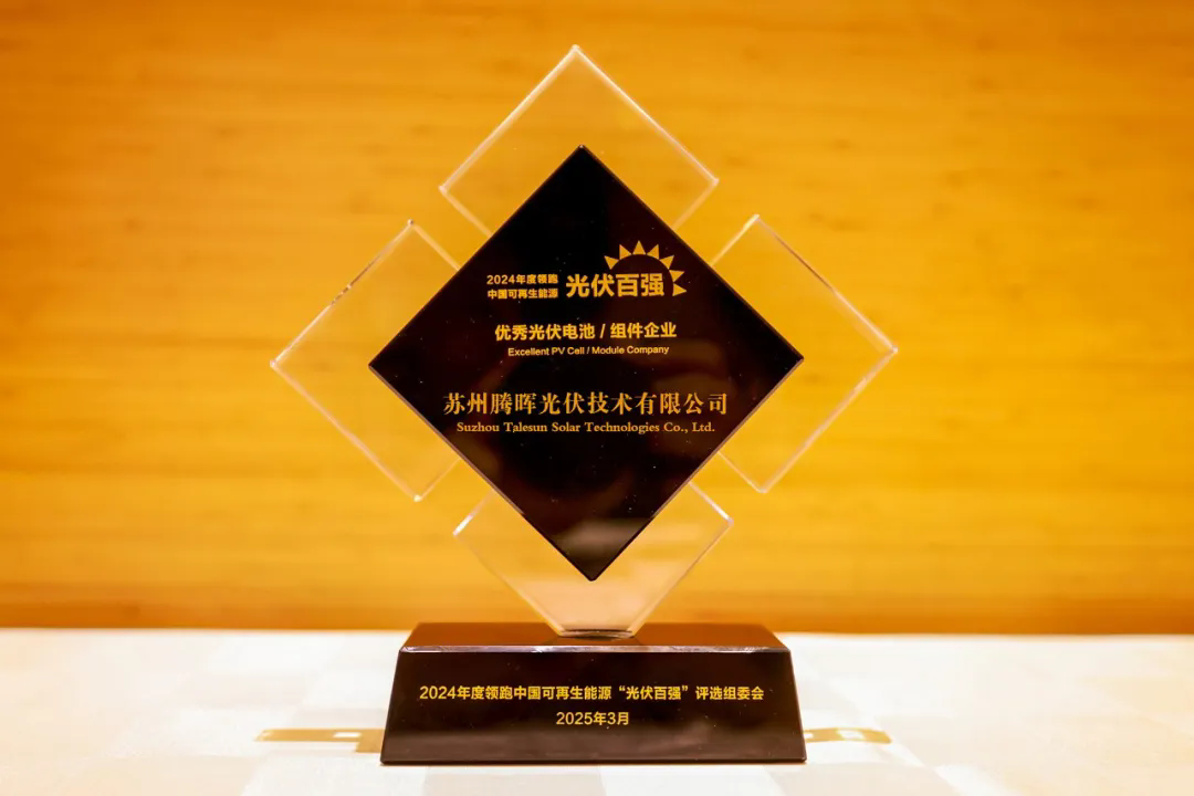 Recently, the “12th China (Jiangsu) International Conference on Innovative Development of New Photovoltaics,” organized by the Jiangsu Renewable Energy Industry Association, was grandly held in Nanjing. Suzhou Talesun Solar Technology Co., Ltd. (referred to as “Talesun Solar”), as one of the leading enterprises in the new energy sector, was invited to attend and was awarded the title of “2024 Leading China Renewable Energy Outstanding Photovoltaic Cell/Module Enterprise” for its exceptional technological innovation capabilities. The conference brought together over 400 representatives from government departments, industry associations, research institutions, and enterprises across the industrial chain. In-depth discussions were conducted on core topics such as breakthroughs in photovoltaic technology frontiers, analysis of market trends, and interpretation of policy directions, jointly mapping out a blueprint for the high-quality development of the industry.