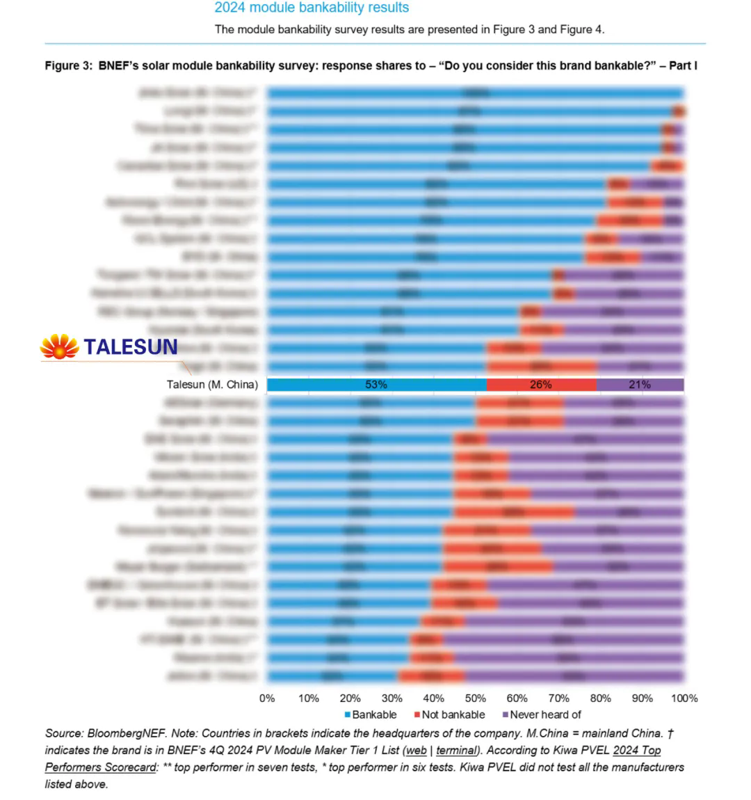 Recently, BloombergNEF (BNEF), a globally renowned research institution, released its 2024 PV Module and Inverter Bankability Report. Talesun Solar achieved a top ranking due to its strong financial stability and solid corporate credibility. This authoritative certification not only reaffirms the reliability of Talesun’s products and brand value but also establishes its modules as a benchmark for “low-risk, high-value” green assets in the eyes of global financial institutions and investors.